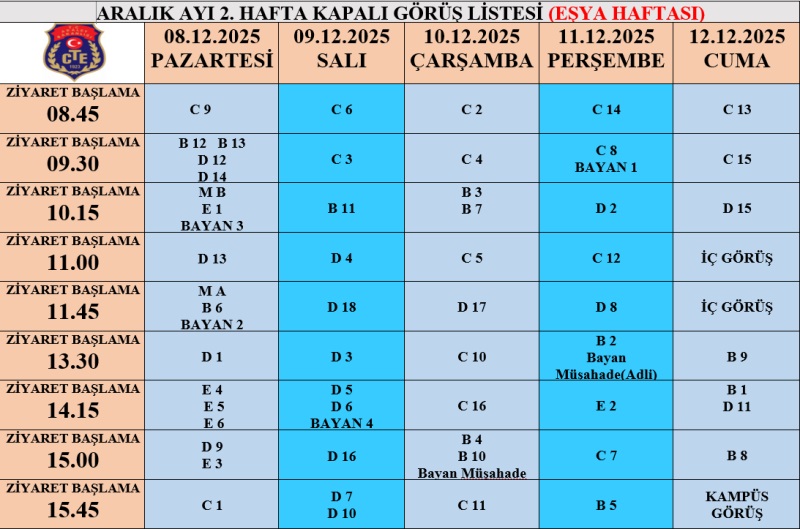 Bu haftalarda açık görüş yaptırılacağı için kapalı görüş yaptırılmayacaktır. Açık görüş duyurusuna ulaşmak için burayı tıklayınız. |
